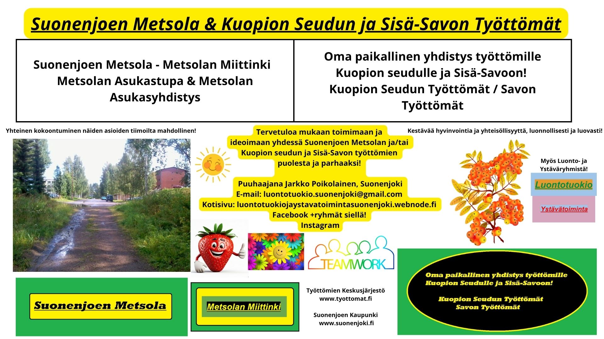 Moi! Suonenjoen Metsola. Metsolan Miittinki. Metsolan Asukasyhdistys & Metsolan Asukastupa? Kuopion seudun ja Sisä-Savon työttömät. Oma paikallinen yhdistys työttömille Kuopion seudulle ja Sisä-Savoon? Luontotuokio ja Ystävätoiminta? Miltä vaikuttaa? Kiinnostaako? Haluatko mukaan porukkaan toimimaan? Tervetuloa mukaan vaan suunittelemaan ja...
